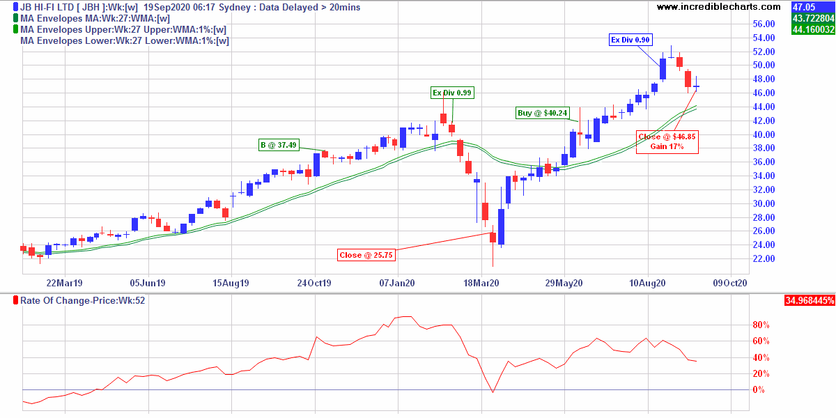 - Only trades when the ASX100 is rising as defined by a weekly close above the 27 week WMA + 1%. The system turns off when the ASX100 falls below the 27 Week WMA